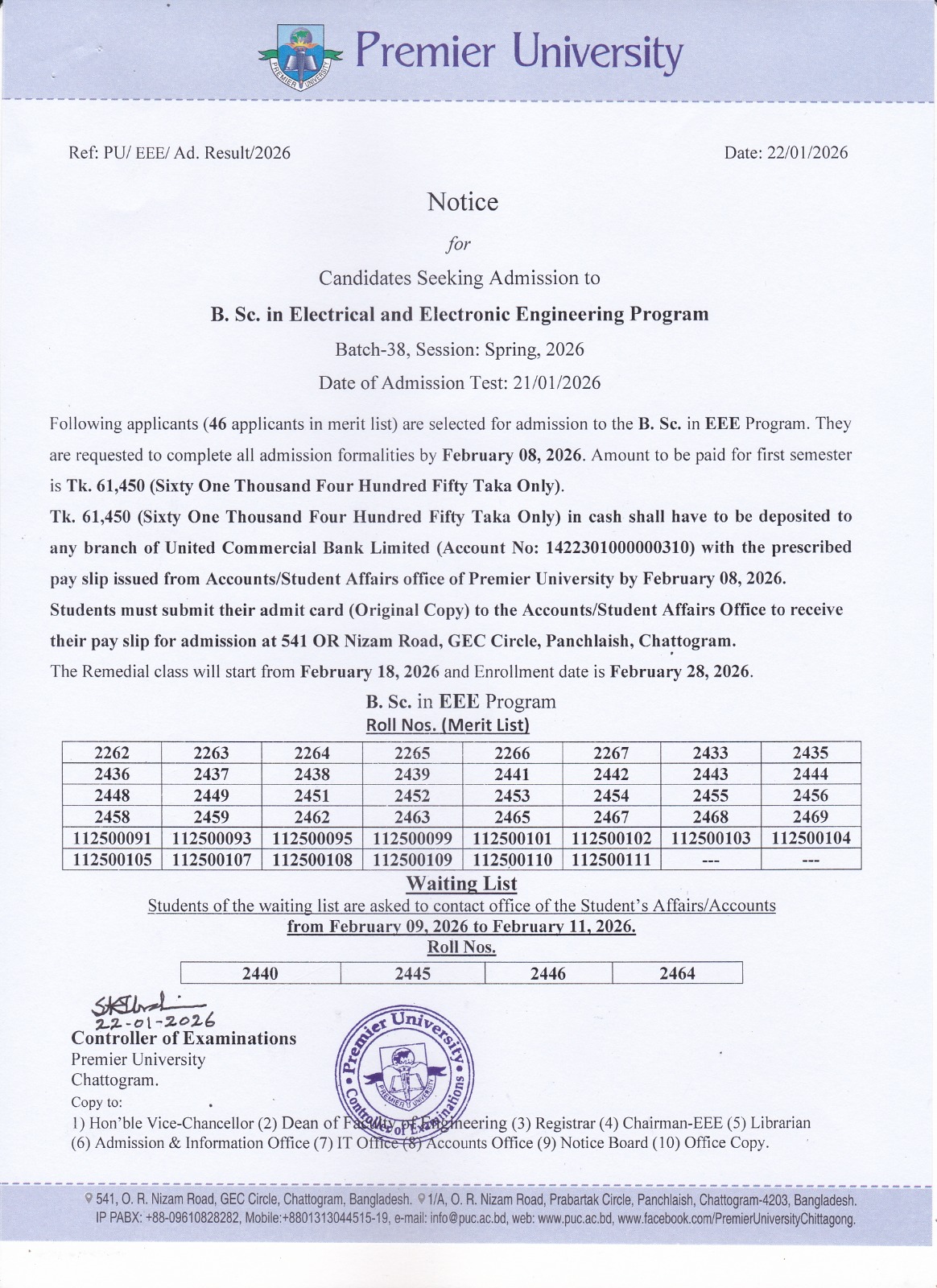 Notice B.Sc in EEE Admission Test Result,Date of Admission Test: January 21, 2026,Publication of Result: January 22, 2026